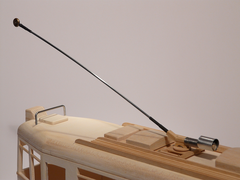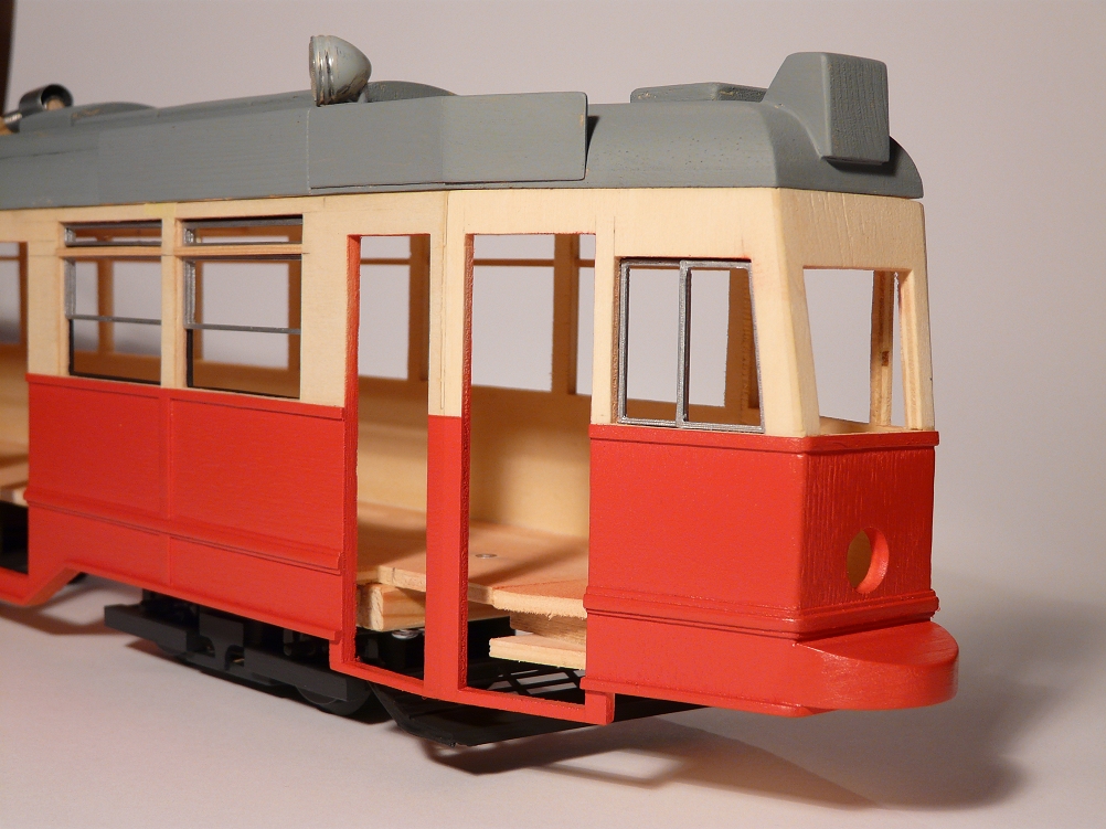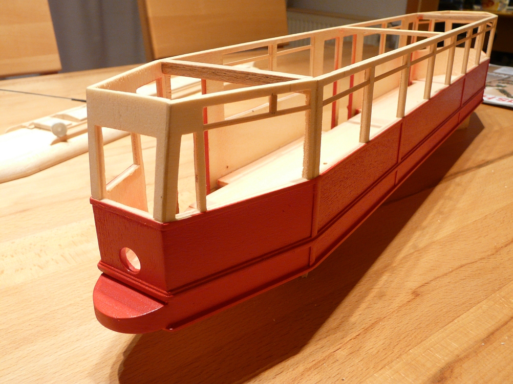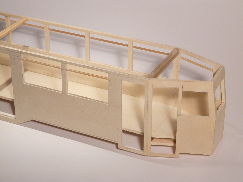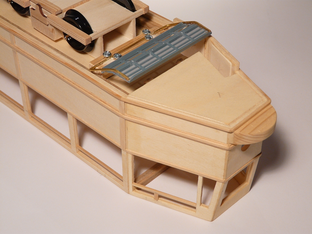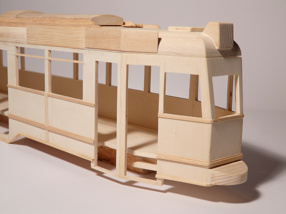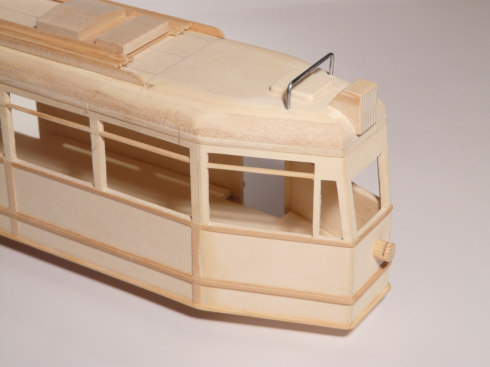 ![]() So langsam wird das Modell seinem Vorbild etwas ähnlicher, wobei die Dachaufbauten für die diversen Anzeigen durch das massive Holz immer noch zu dominant wirken. Es fehlt hier noch die Aussparung für den einzigen Scheinwerfer. |