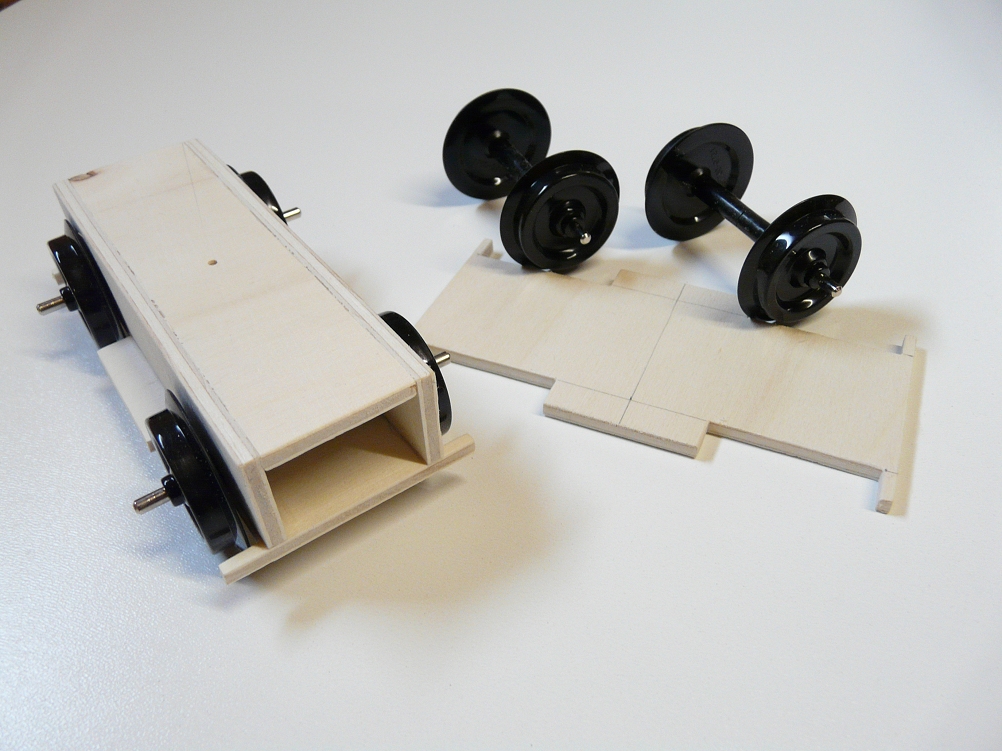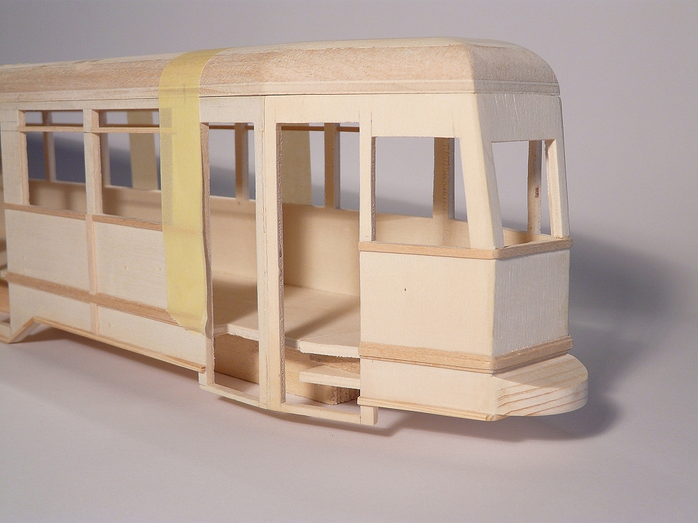 ![]() Leider gibt es keine früheren Fotos; der Anfang war schwer und nicht sonderlich ermutigend. Hier sind bereits die beiden Fahrzeugenden eingepasst. Wäre der Übergang vom Wagenkasten zum Fahrerstand und dem Fahrzeugende fehlgeschlagen, wäre viel Laubsägearbeit für die Tonne gewesen. |