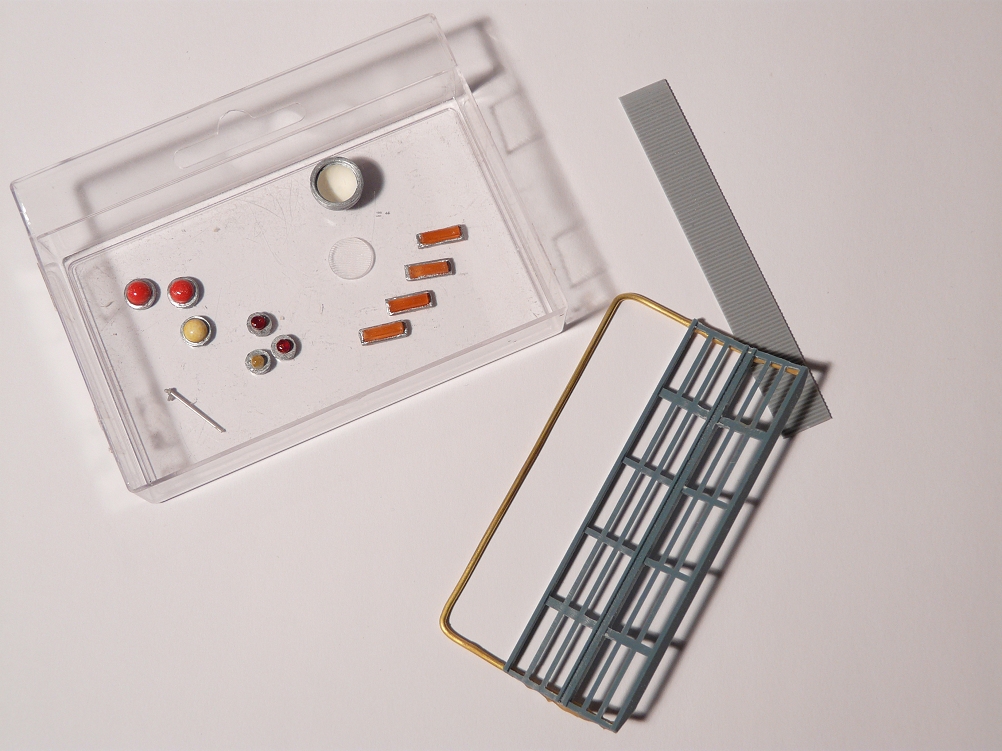 ![]() Kleinteile für Blinker und Leuchten sowie der Rohbau des Fanggitters zur Montage unter dem Fahrerstand. Dieses Fanggitter konnte abgesenkt werden, um das Überfahren von Personen zu verhindern. |
