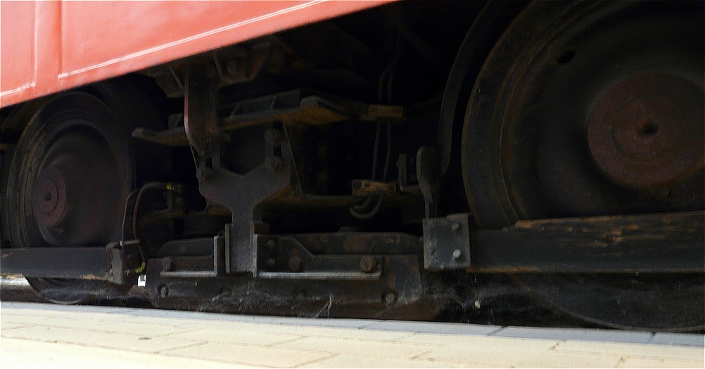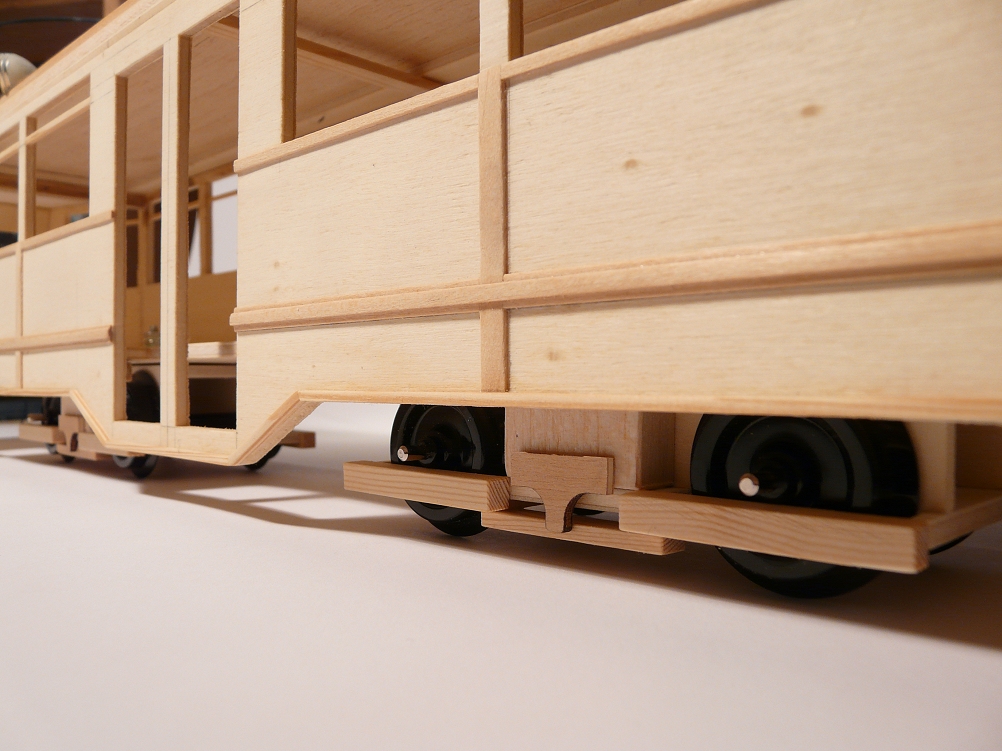 ![]() Das Fahrwerk wurde ebenfalls in Holzbauweise erstellt. Für die Räder wurden Radsätze der Firma Pico verwendet, die nahezu exakt den Maßen des Vorbildes entsprachen. Wie man deutlich sehen kann, besitzt das Modell keinen Antrieb - ist also nur für die Vitrine gedacht. Da steht es auch mittlerweile. Im Original hatte jeder Triebwagen vier Motoren mit jeweils 50 kW - dies entspricht etwa insgesamt flotten 270 PS. |