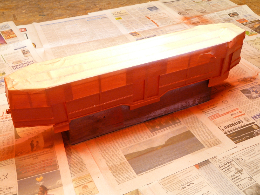 ![]() Im Bild ist das Modell zu sehen, wie es abgeklebt auf die weiteren Schichten der roten Lackierung wartet. Insgesamt habe ich 10 Schichten pro Farbe mit den entsprechenden Trocknungspausen aufgetragen. Dazu habe ich handelsüblichen Seidenglanz-Lack aus der Spraydose verwendet. Für den roten Farbton war es RAL 3000 und für die beige Lackierung des oberen Wagenkastens die RAL-Farbe 1015. Im Original soll die Hamburger Straßenbahn für den oberen Wagenkasten die RAL-Farbe 1001 verwendet haben. Ein Abgleich mit dem Farbfächer ergab allerdings, dass Beige doch sehr dunkel wirkt, zumal auf Fotos eher ein gelblicher Farbton erkennbar ist. Insofern ist das "Hellelfenbein" ein (guter?) Kompromiss. |