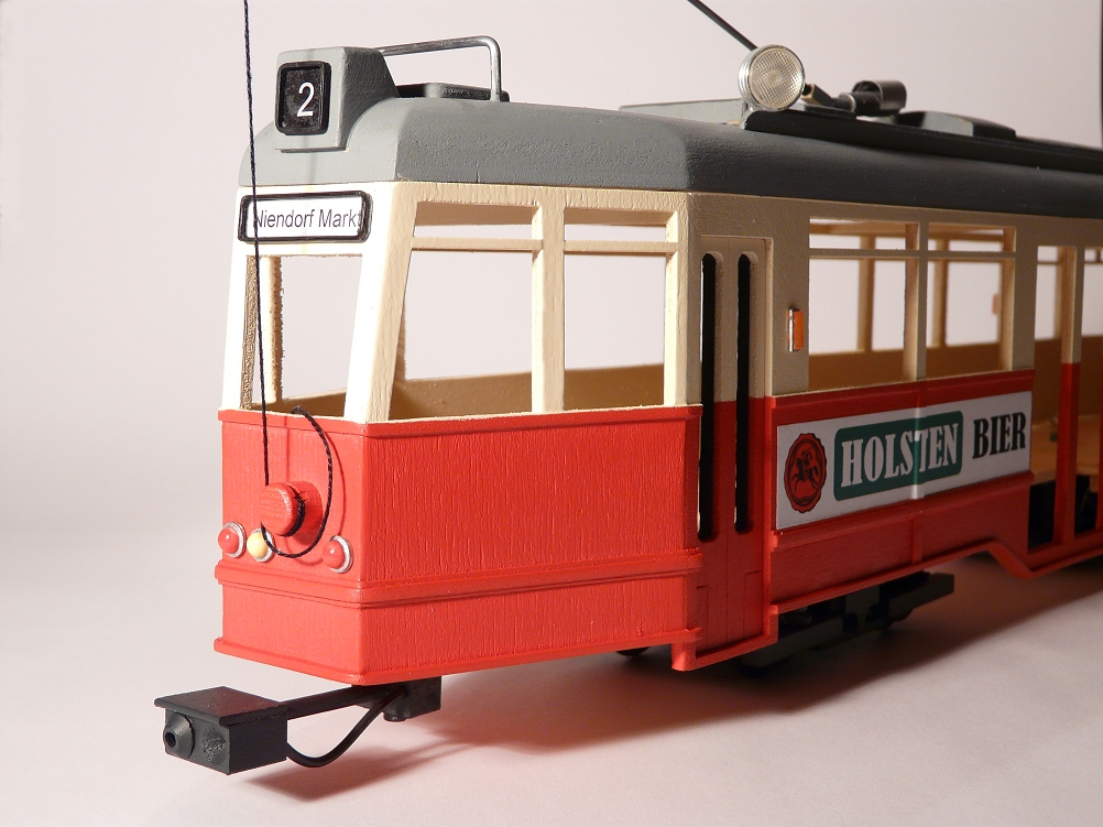 Zu diesem Zeitpunkt habe ich diese „Oldtimer“ wirklich nicht geliebt. Sie schienen bereits zum Ende der 70er Jahre aus der Zeit gefallen und in die Jahre gekommen; gnadenlos auf Verschleiß gefahren und von der Politik auf das Abstellgleis geschoben. Als kleiner Junge Anfang der 60er kann ich mich jedoch an viele Fahrten mit der Linie 16 zur Endstation Hagenbecks Tierpark erinnern; an junge Schaffnerinnen mit kecken Hütchen im Heck der Wagen. In unmittelbarer Nähe der Wendeschleife vor dem imposanten Eingangsportal des Tierparks wohnte meine Lieblingsoma in einer Schrebergartenkolonie ohne fließend Wasser und mit Plumpsklo auf dem Grundstück. Ich hatte immer die Sorge, den Zeitpunkt des Ausstiegs zu verpassen und von meiner Mutter durch das Schließen der Türen getrennt zu werden. Wahrscheinlich war ich ein Schisser, dem die eigenen Hosen immer viel zu kurz erschienen. Aber die Hamburger Straßenbahn war eine Institution wie die Hamburger U-Bahn. Soviel zu meiner Sozialisation mit der Hamburger Straßenbahn und ihren markanten Wagen. Die Faszination für diese, im Falkenried nach Schweizer Vorbild gebauten Vehikel hat mich nie wirklich losgelassen und so beschloss ich im Winter 2017 einen Straßenbahnwagen nach dem Vorbild der Hamburger Straßenbahn im LGB-Maßstab 1 : 22,5 zu bauen. Dies war ein sehr ambitioniertes Vorhaben von dessen Erfolg ich anfangs nicht ansatzweise überzeugt war. Es war vorgesehen, die Karosserie überwiegend aus Sperrholz (3 mm) zu fertigen. Türen, Fenster und Spezialteile (?) sollten mittels eines aus einem Bausatz erstellten 3D-Druckers der Marke „vellemann“ und die wesentlichen Deko-Elemente am PC erstellt werden. Die Wahrscheinlichkeit des Scheitern war relativ hoch, obwohl ich bereits einige Erfahrung bei der Erstellung von Straßenbahnmodellen der Spanischen Firma OCCRE vorweisen konnte. Den letzten Stein des Anstoßes lieferte eine sehr gute maßstäbliche Darstellung eines Modellbauers aus dem Internet (vielen Dank dafür), die ich auf den Maßstab 1 : 22,5 umgerechnet habe. Zudem hatte ich das Glück, dass in einem Baumarkt in Hamburg Niendorf (einem ehemaligen Straßenbahndepot) eine leidlich restaurier-te Hamburger Straßenbahn direkt in Augenschein zu nehmen ist/war. Viele Fotos - auch von der Rolltreppe in das erste Obergeschoss (Details zu den Dachaufbauten) - haben letztendlich zum Gelingen des Projektes beigetragen. Aber sehen Sie selbst, ob ich den Mund etwas zu voll genommen habe, und der Versuch als eher so „mittel“ zu bewerten ist. Ich bin jedenfalls ein wenig stolz auf meine Hamburger Straßenbahn, mit der ich gern wieder fahren würde. Trotz aller „Rumpeligkeit“ würde sie dem Klima gut tun. |
