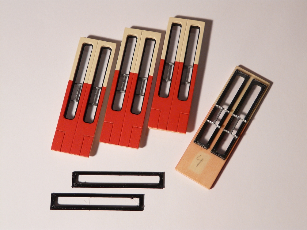 ![]() Erste "Anprobe" der per 3D-Drucker erstellten großen Fenster des Wagenkastens. Der Druck eines solchen Fensters dauerte ca. 7 Minuten - und leider gab es dabei auch noch Ausschuß. |