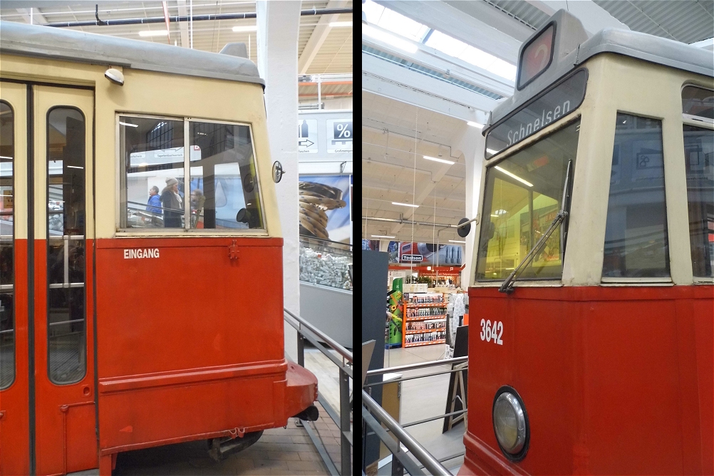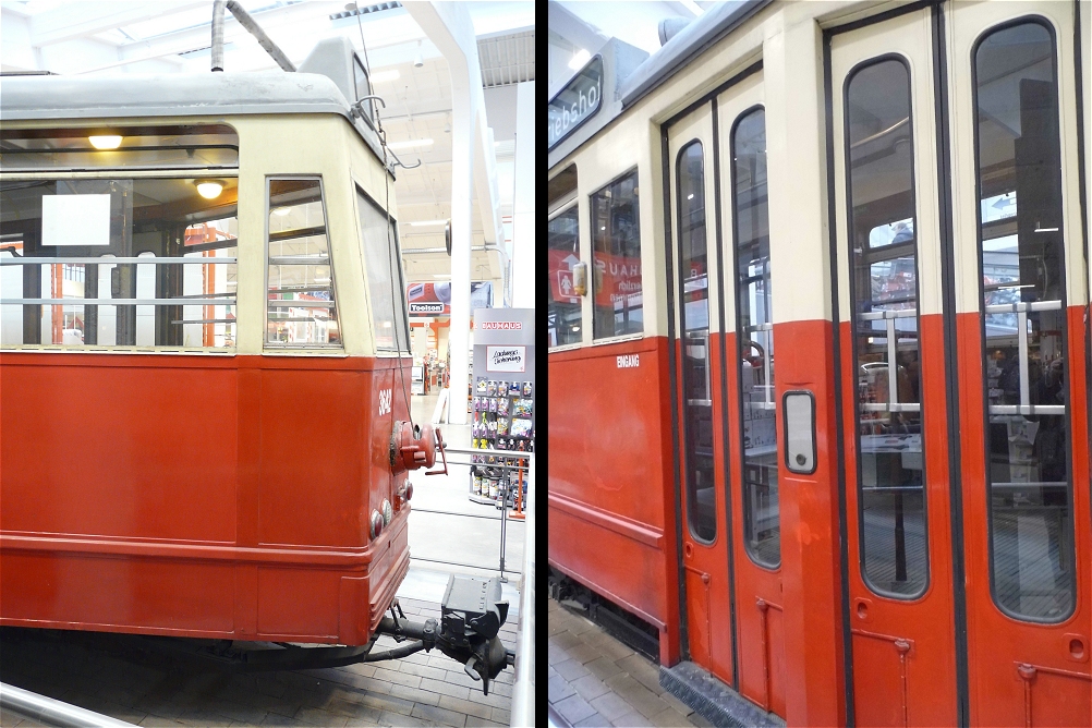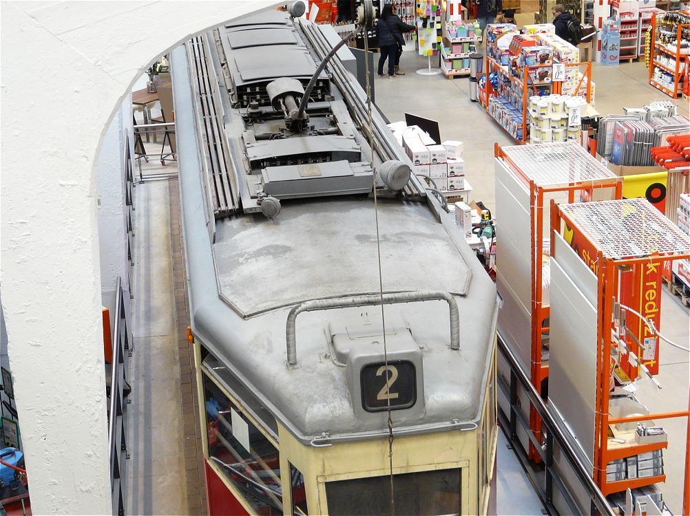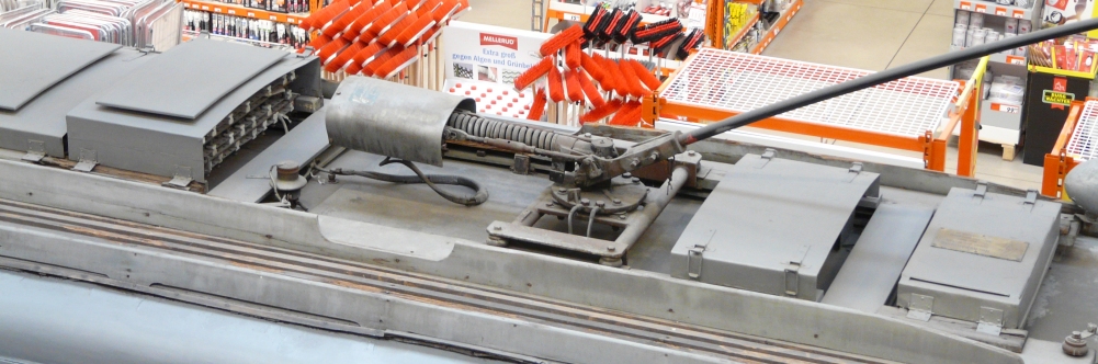 ![]() Leider ist die Tram mittlerweile zwischen den Waren des Baumarktes derart eingepfercht, dass schöne Aufnahmen nicht mehr möglich sind. Immer ragt irgendein Produkt in das Bild hinein. Dies war zunächst deutlich anders und die aktuelle Präsentation wird derm Objekt nicht mehr gerecht, was sehr schade ist. Leider scheint es auch kein Nutzungskonzept für den Innenraum der Tram zu geben, was irgendwie auch wieder eine vertane Chance ist. |