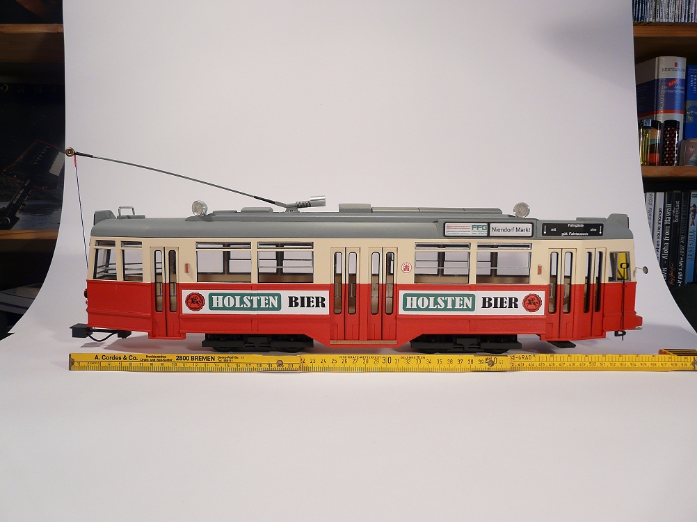 ![]() Auch als das Dach den Wagenkasten nach oben abschloss, war ich nicht wirklich davon überzeugt, auf einem guten Weg zu sein. Das Dach wirkte einfach zu plump, obwohl die Maße stimmig waren. Auf dem nachfolgenden Originalfoto der Hamburger Straßenbahn aus dem Baumarkt in Hamburg ist die Struktur des Wagenkastens mit seinen Vertsärkungen und Verstrebungen gut zu erkennen. |