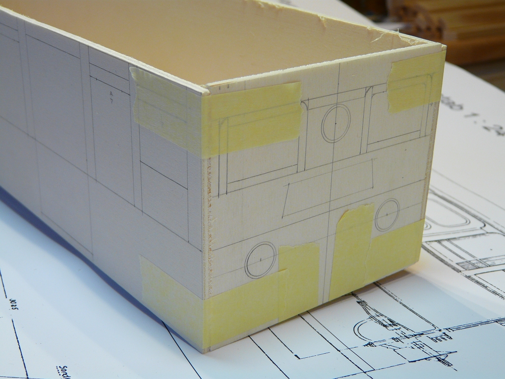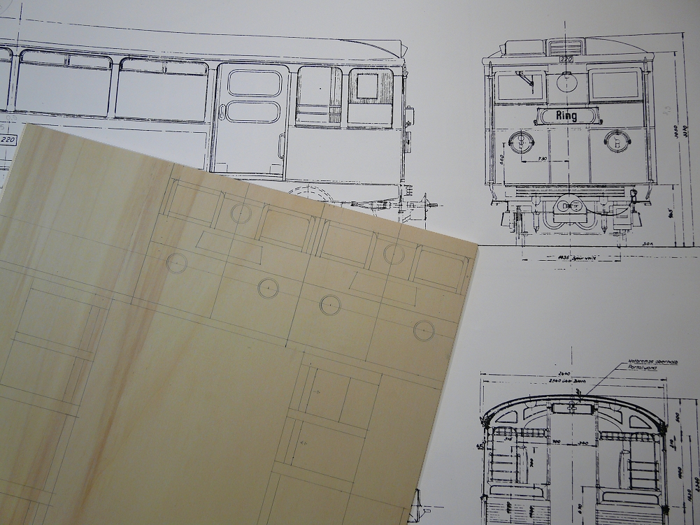 ![]() Eine zeitraubende aber entscheidende Arbeit ist die absolut exakte (!) Übertragung der Maße aus dem Plan auf die Sperrholzplatten (3 mm Stärke), die die Grundlage des Wagenkastens bilden. |