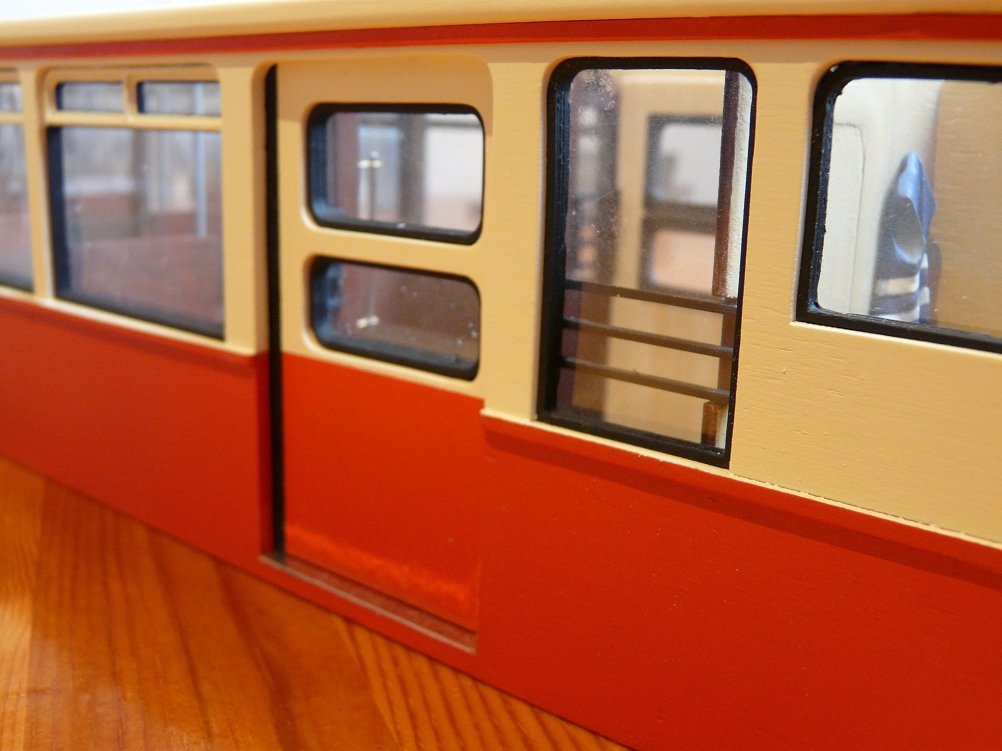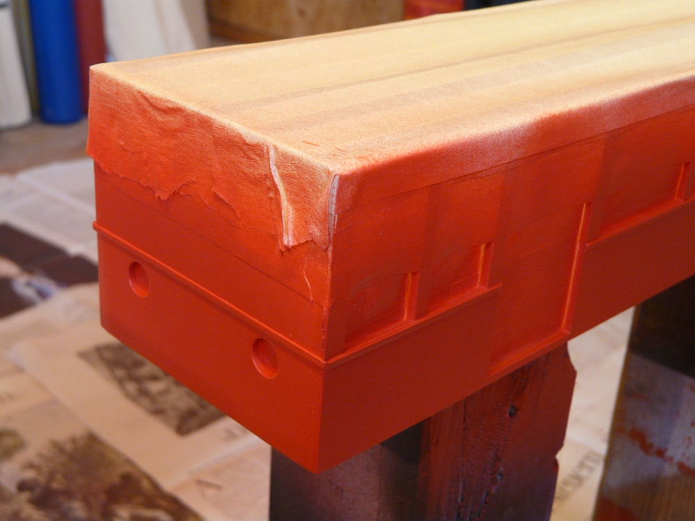 ![]() ...Abklebung für die rote Lackierung des Wagenkastens. Zwischenzeitlich wurden auch Leisten an dem Wagenkasten montiert. |