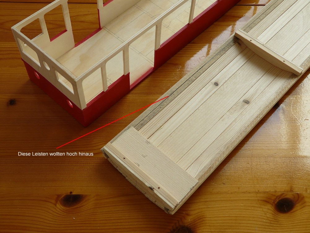 ![]() Jeweils zwei Leisten aus der rechten und linken Seite des Daches stammen von Sylvesterraketen. Diese Leisten waren also echt schon abgehoben. |