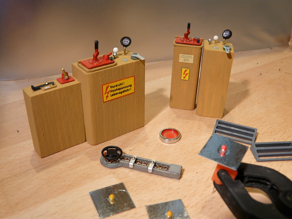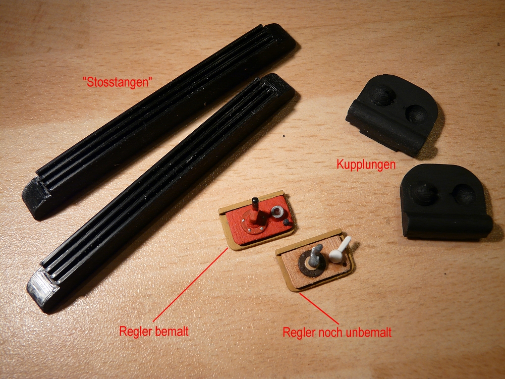 ![]() Die Führerstände bzw. Fahrtregler sind relativ frei nach eigener Fantasie gestaltet, da in den unterschiedlichen Dekaden bzw. in der bis zu 58 Jahren währenden Betriebszeit gemäß der technischen Entwicklung auch Anpassungen erforderlich waren. Die silbernen Quadrate sind die Täger der Glühbirnen. Das Handrat mit Kette ist eine Nachempfindung der Feststellbremse (Ob das so ist? Da bin ich mir nicht ganz sicher). |