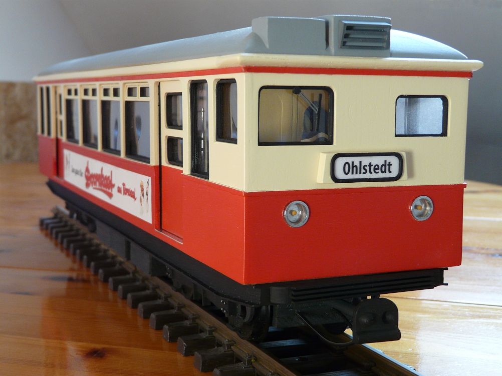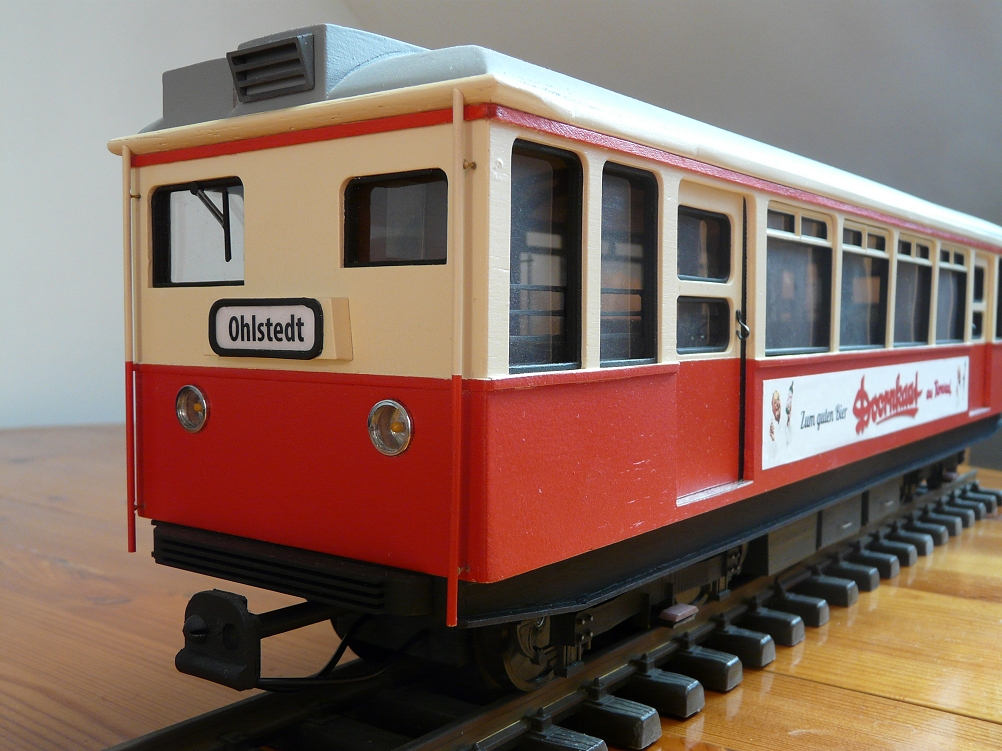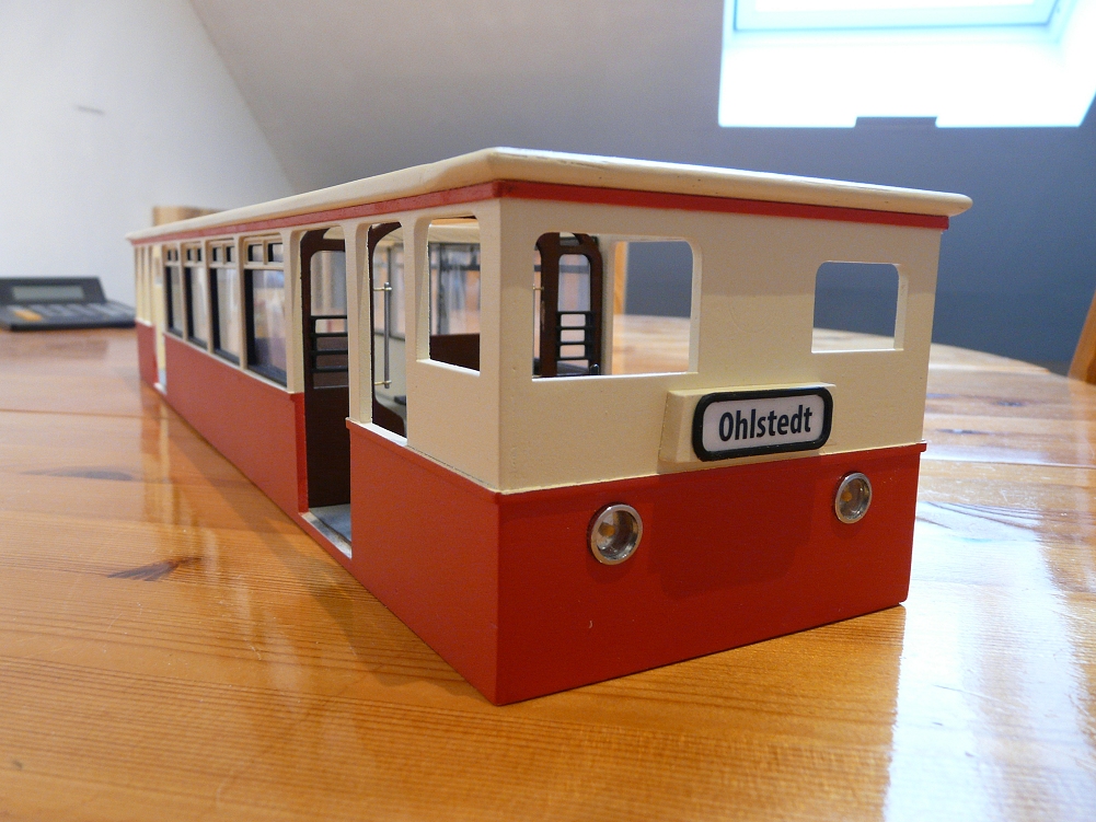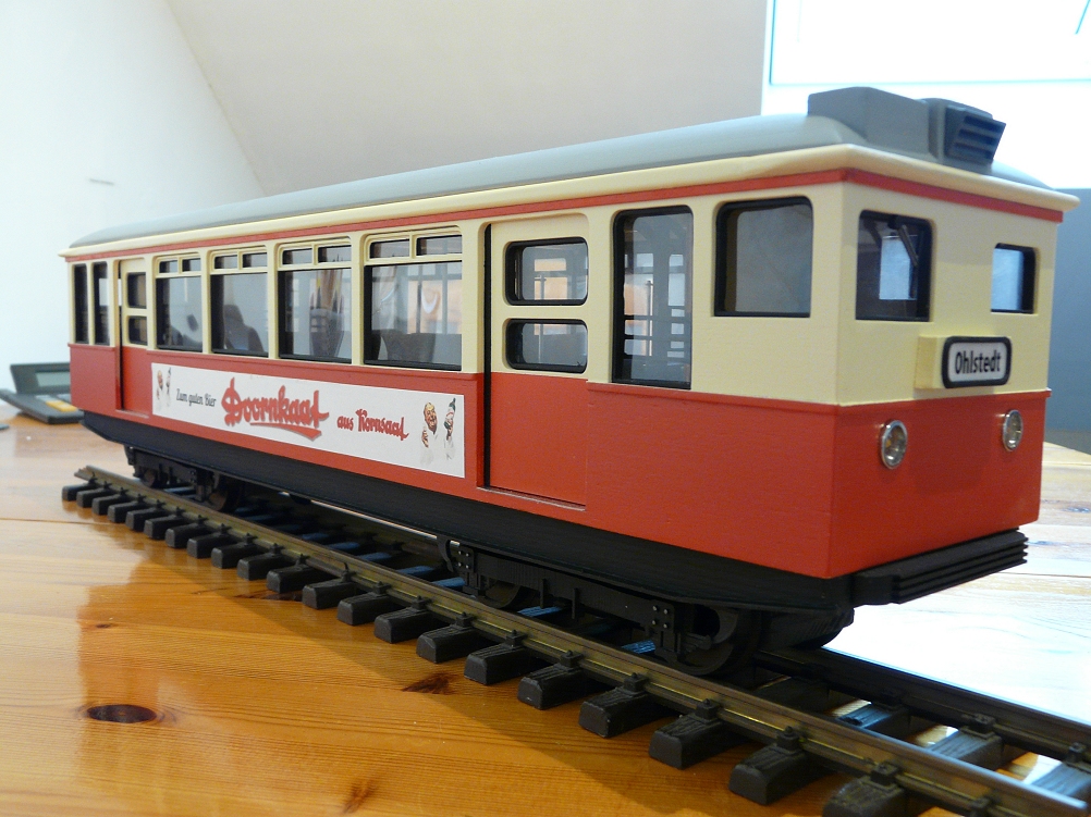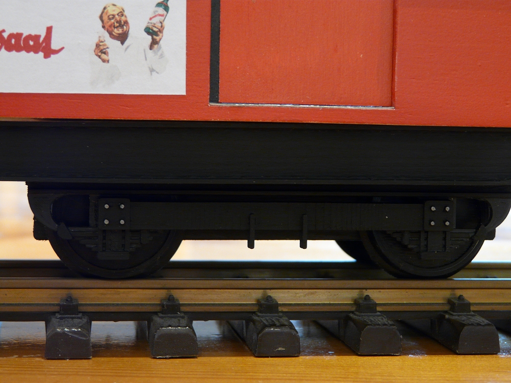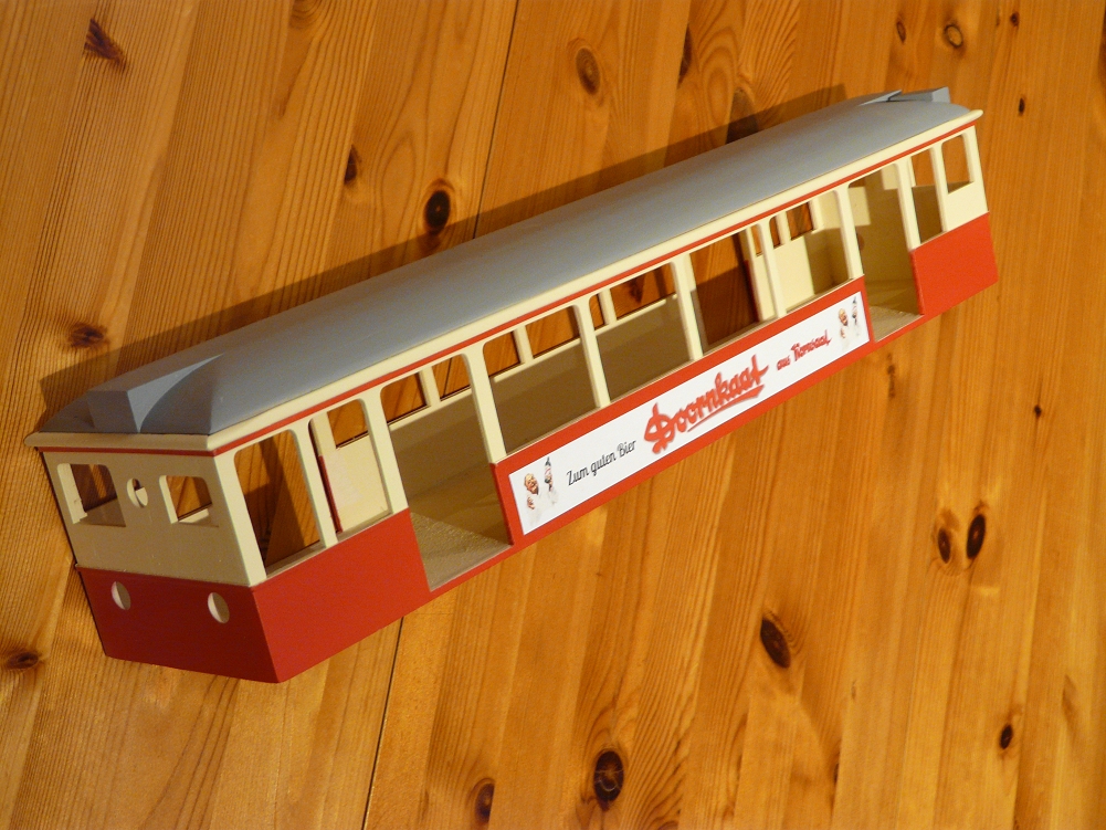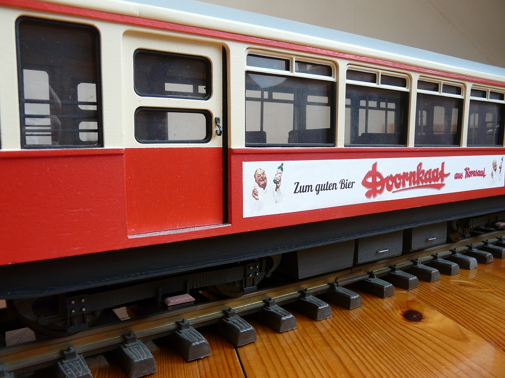 ![]() Der fertig lackierte Wagenkasten mit oberen Abschlussleisten, fertigem Dach und der probehalber aufgelegten Doornkaat-Werbung. |