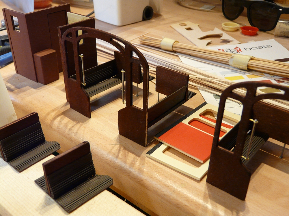 ![]() Trenn- und Führerstandwände (frisch gebeizt bzw. gestrichen), Sitzgruppen und Türen warten in der Werkstatt auf den Einbau in den Wagenkasten. |