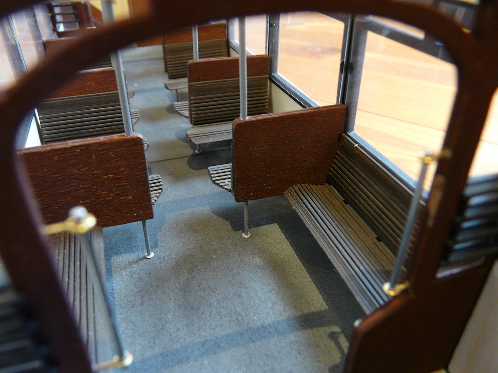 ![]() Und hier noch aus der "Vogelperspektive" die Sitzgruppe. Das Fahrzeug hatte insgesamt 32 Sitzplätze und 95 Stehplätze (da konnte es sehr eng werden). Der Bodenbelag wurde bereits gealtert. |