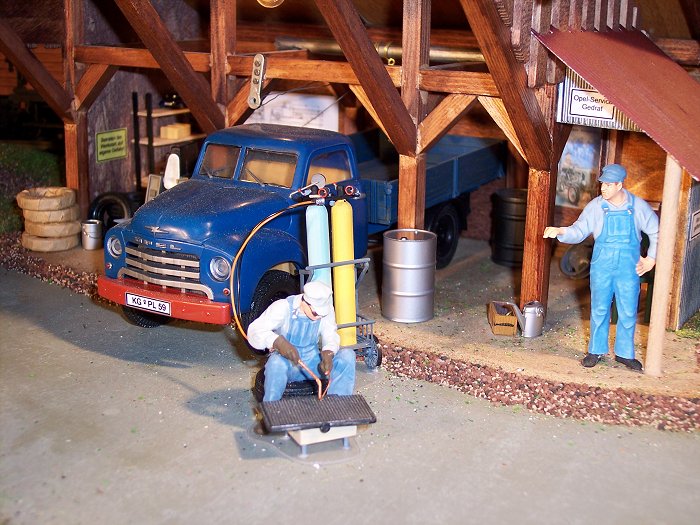 Unsere Eigenbau-Werkstatt; mit Opel-Blitz und dem pedantischen Chef.