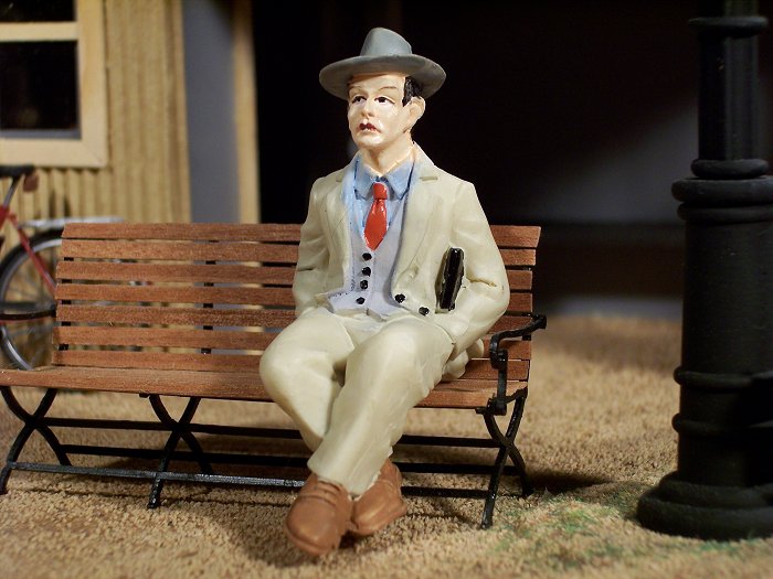 Mann trägt Hut und relativ grosse Schuhe. Schön filigran ist die Bank.