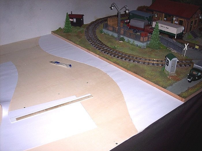 Eine Schablone geschnitten für die "Geländeteile" aus Styrodur.