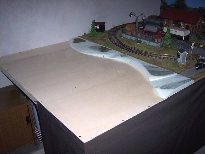 Die Platte aus einem alten "Warhammer"-Szenario angebaut; den Stoff bereits wieder angetackert,