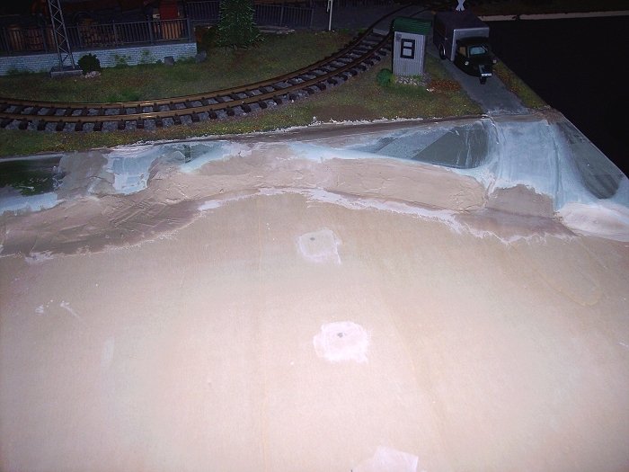 Mit Fugenspachtel die Übergänge und Geländeprofile moduliert. Das Zeug bleibt lange modulierfähig und