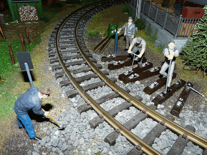 Die Truppe von Gleisbauarbeitern hantiert - etwas planlos - an alten Schwellen. Was die da genau