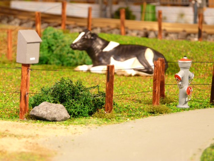 Die Kuh lässt es sich gut gehen. Briefkasten und Hydrant sind altmodisch aber funktionell. Der
