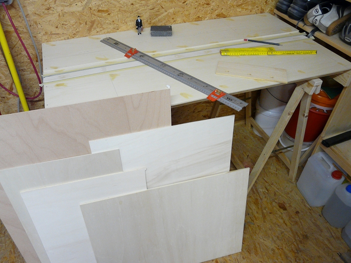 Im Verlauf der letzten Monate aufgekaufte "Resteplatten". Wiederum bei Obi zum Preis von 0,50 bis 3,50 Euro erstandene Sperrholzplatten...Seitenwände unserer Gebäude