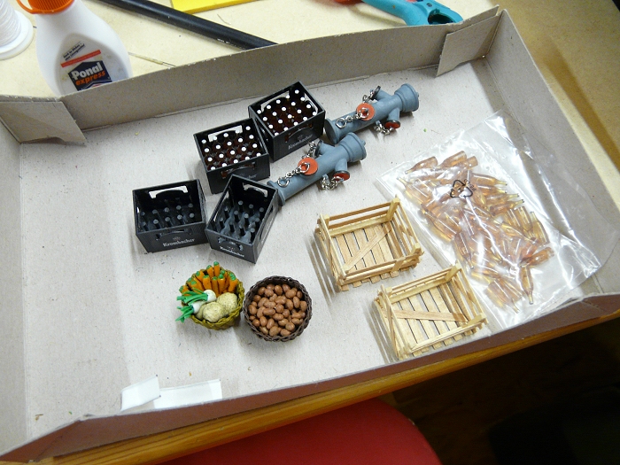 sich um Bäume, Material für den Marktstand, Preiserlein und "Mauerstein-Material" für die Gebäude. In den nächsten Wochen wird unser Diorama weiter
