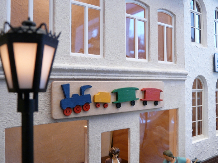 Der Spielwarenladen entsteht. Als erstes wurde ein neues Firmenschild installiert. War eine sehr knifflige Arbeit,