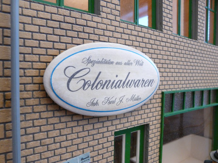 Im Detail das Firmenschild unseres Colonialwaren-Ladens. Fragen Sie bitte nicht, wer Karl J. Müller ist.