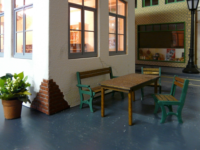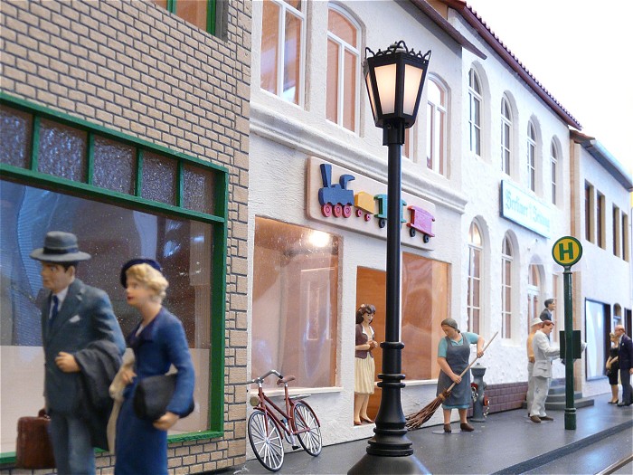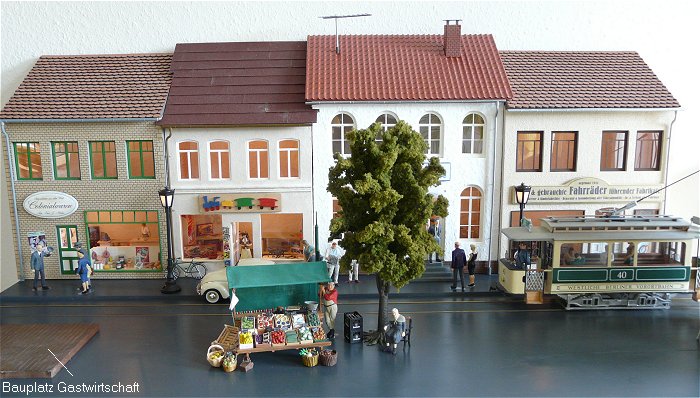 Unsere "Flaniermeile"; alle vier Gebäude aus der Perspektive eines sehr kleinen Preiserleins. Sehr stimmungsvoll, obwohl noch nicht fertig.