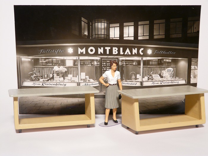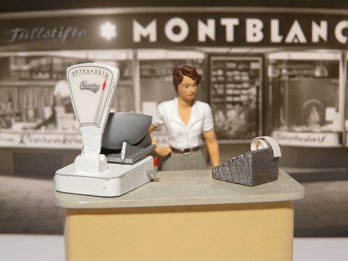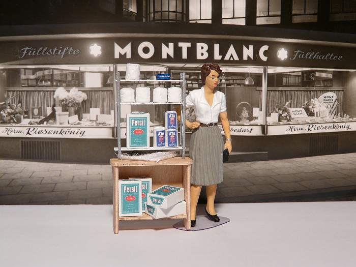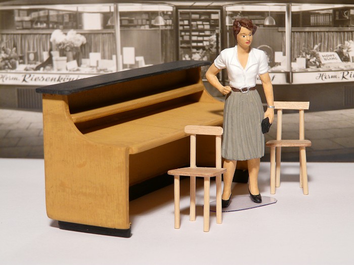 Hier wiederum die freundliche Verkäuferin des Möbelhauses (jetzt angestellt im Colonialwaren-Geschäft), die auch den Tresen für die Anzeigenannahme inkl. 2 Stühlen des Druck- und