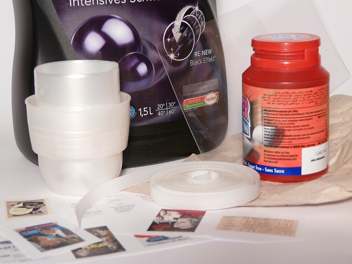 Ob Sie es glauben oder nicht, aus diesem Sammelsurium soll sich eine Littfass-Säule formen lassen. Eine Kappe eines Waschmittels, eine Verpackung eines