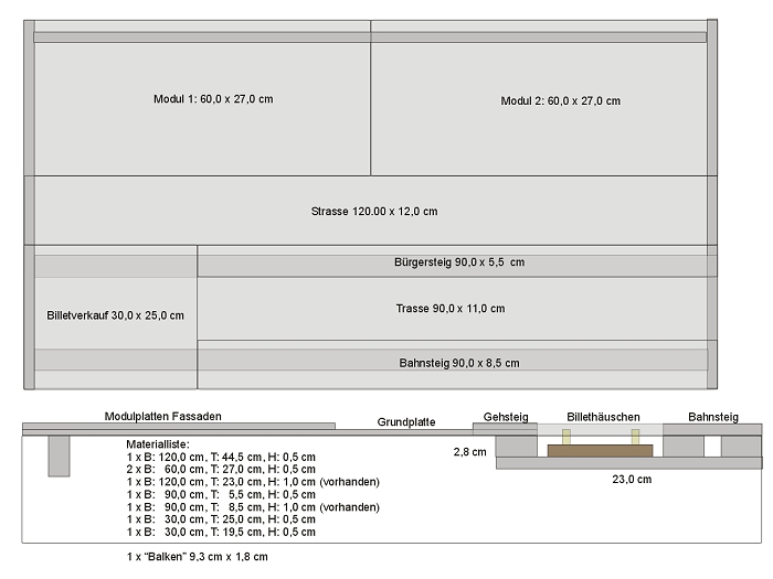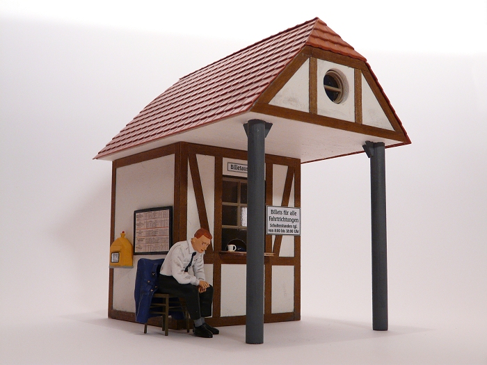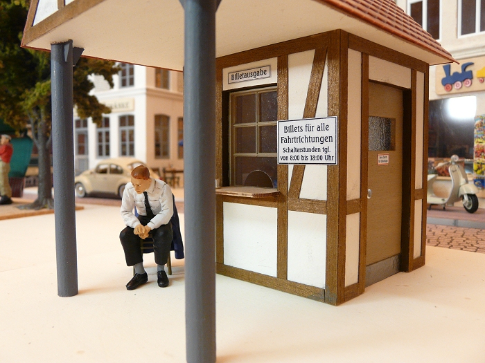 Umbauten eines Piko-Bausatzes Neubau Billethäuschen für Kopfbahnhof Planung für das neue Modul Neubau aus Resten Fuhrpark und Verlagsetage Modul Update Von links nach rechts im Überblich - "Rohbau"