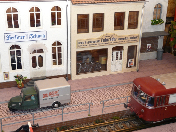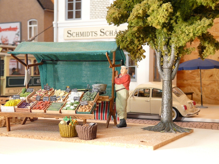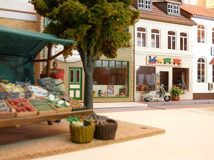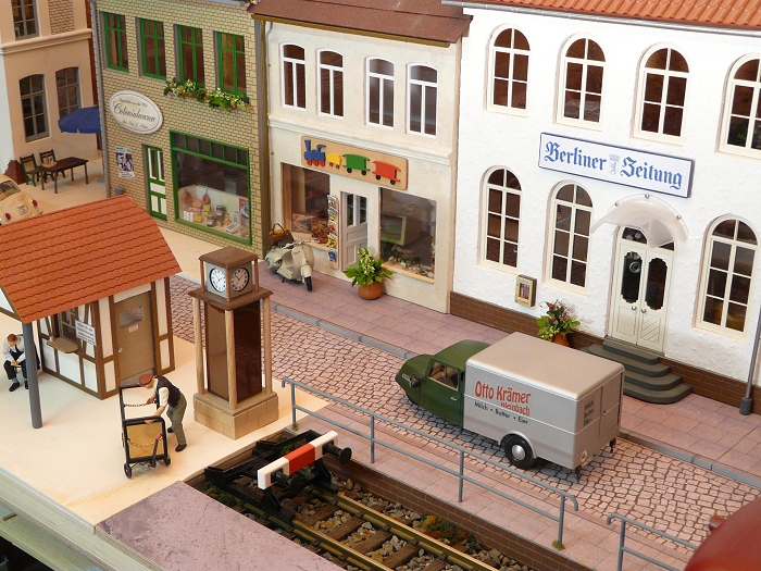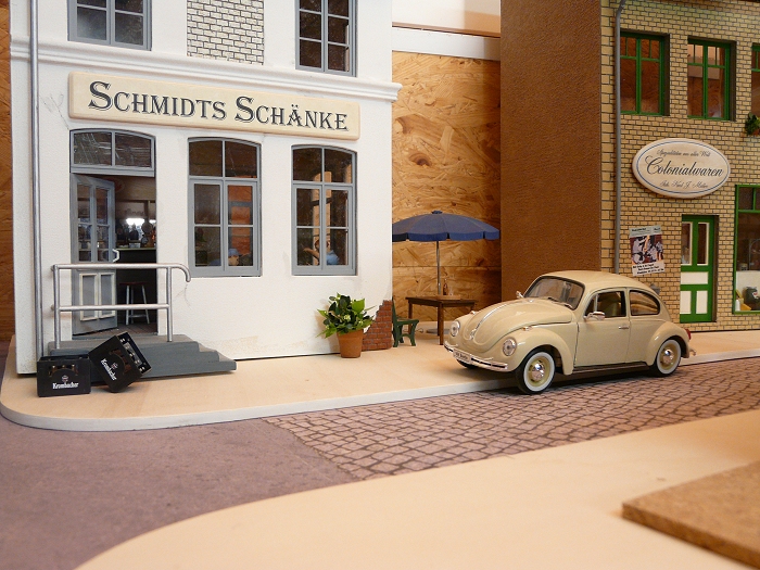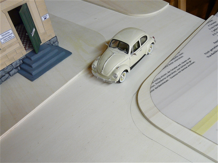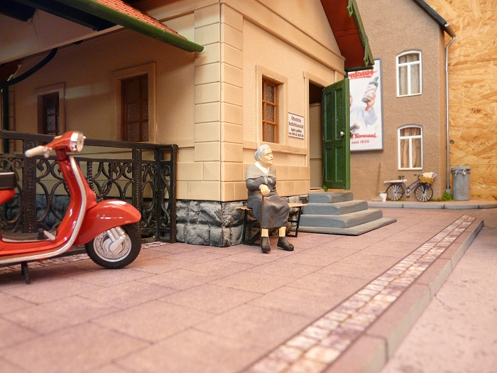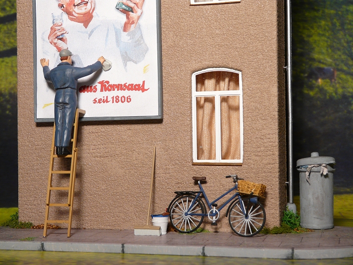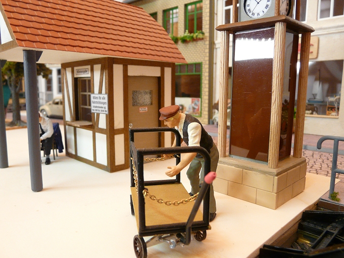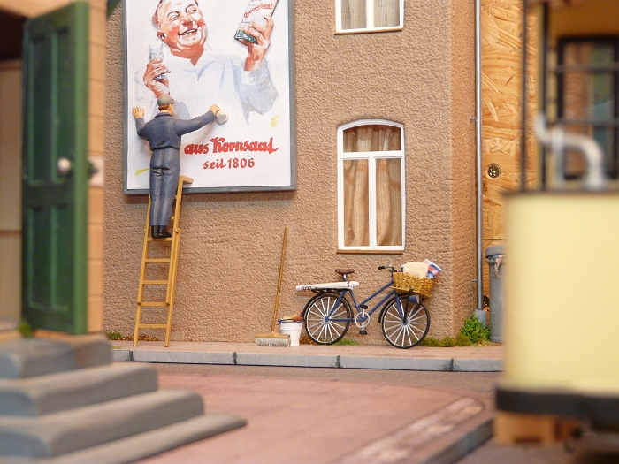 mit "Bodenbelägen" und Grünzeug sowie Figuren, Straßen-Laternen und der Littfassäule und anderen Kleinigkeiten weiter zu